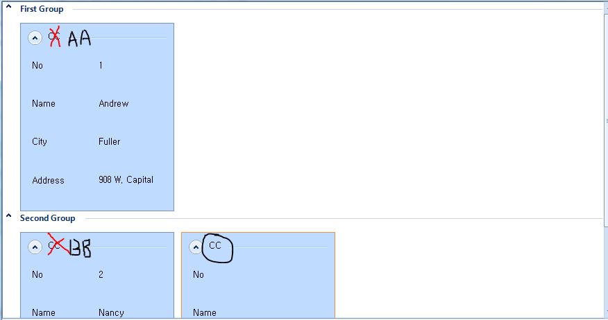 I would like to set the Title of one CardView Item in Second Group to "BB" and the title of another CardView Item to "CC".