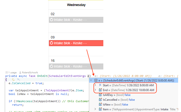 The series start in januari, I open an instance in februari, and SchedulerEditEventArgs shows the series start date, not the occurrence start date.