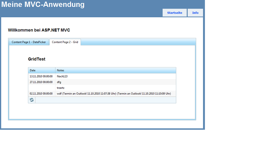 <%@ Page Language="C#" MasterPageFile="~/Views/Shared/Site.Master" Inherits="System.Web.Mvc.ViewPage" %> <asp:Content ID="Content1" ContentPlaceHolderID="TitleContent" runat="server"> Startseite </asp:Content> <asp:Content ID="Content2" ContentPlaceHolderID="MainContent" runat="server"> <h2><%: ViewData["Message"] %></h2> <% Html.Telerik().TabStrip().Name("ReiterMenu").Items( parent => { parent.Add() .Text("Content Page 1 - DatePicker") .LoadContentFrom("DatePickerTest", "TabStrip") .Selected(true); parent.Add() .Text("Content Page 2 - Grid") .LoadContentFrom("GridTest", "TabStrip"); }).Render(); %> </asp:Content>Here you see the TabStripController: