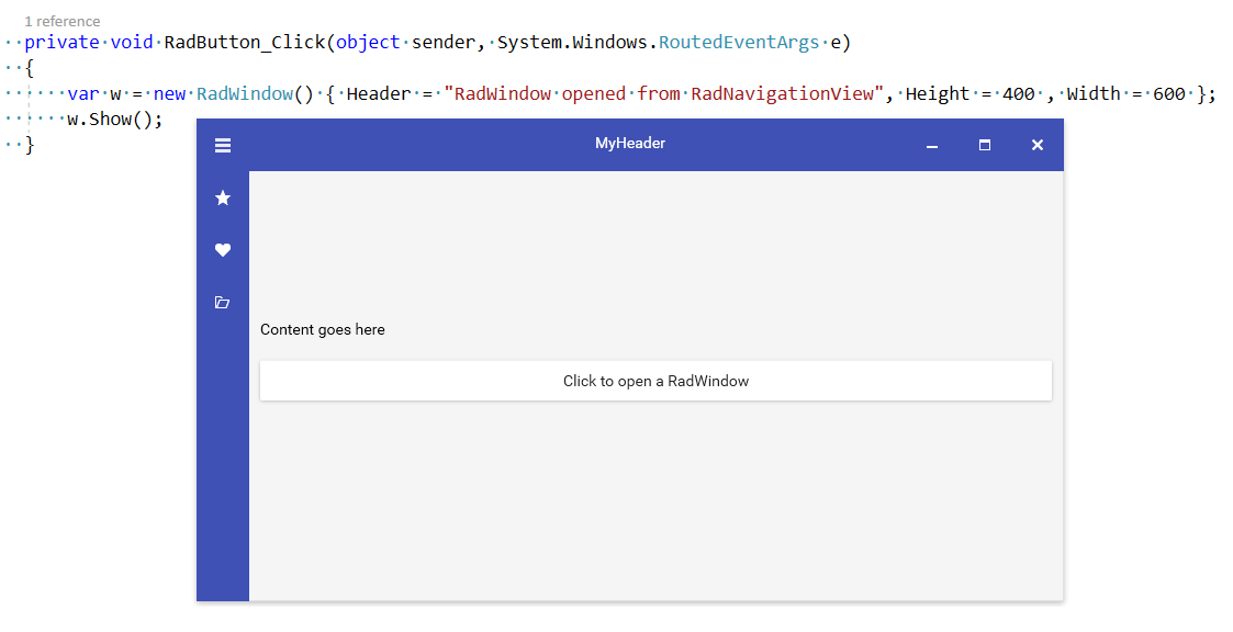 What I really want is that when selecting an item from the RadNavigationView, the content opens a RadWindow or what control do you recommend using?