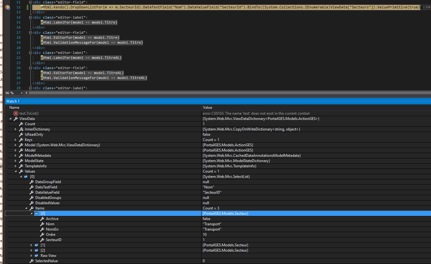 But the dropdown is empty. I think the problem is located at ViewData["Secteur"] that are null. I do not access it like it should. I join a picture of the live watch for the ViewData