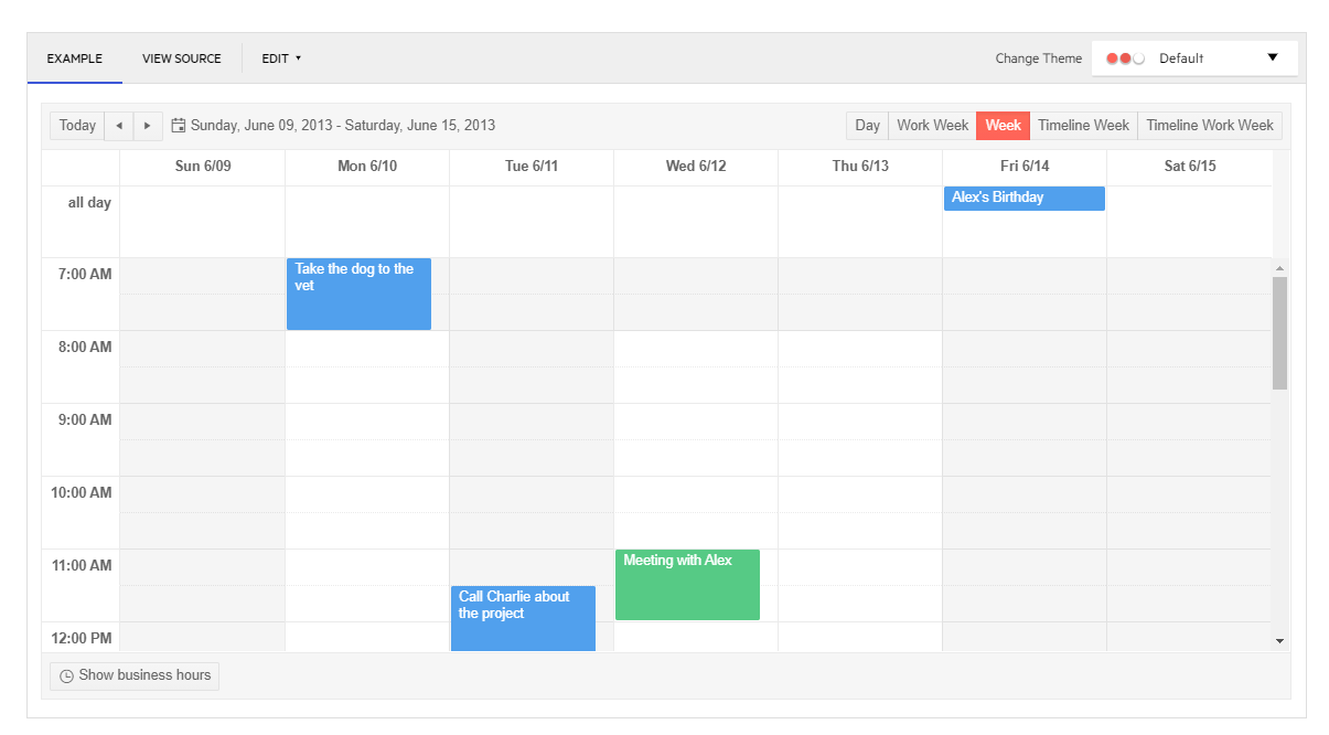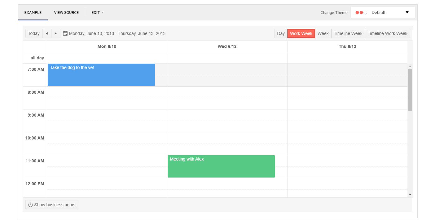 Where in the week View all days are rendered, however, the work days and non-working days are styled differently: