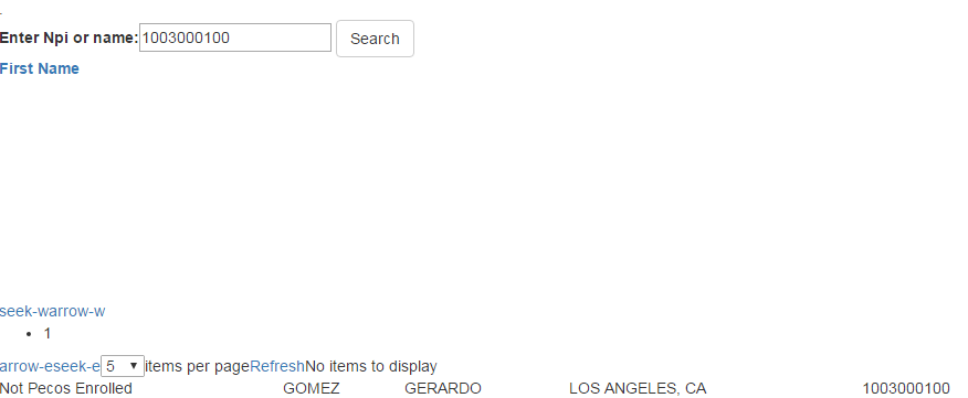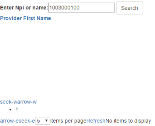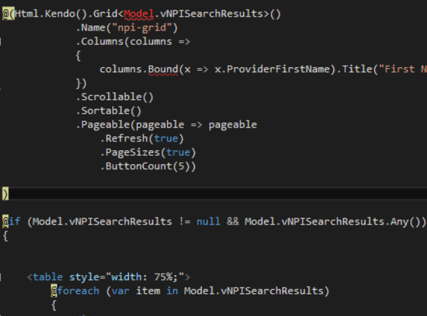 namespace oandp_redesign_wip.Models.Database{ public class vNPISearch { public string NPI { get; set; } public string ProviderFirstName { get; set; } public string ProviderLastName { get; set; } public string OrganizationName { get; set; } public string ProviderBusinessLocationAddressCity { get; set; } public string ProviderBusinessLocationAddressState { get; set; } public string PecosNPI { get; set; } public string PecosPendingReviewNPI { get; set; } }}Alright, so when the page initially loads, it returns an empty List<vNPISearch>. After pressing the Search, it calls a Post that looks like: