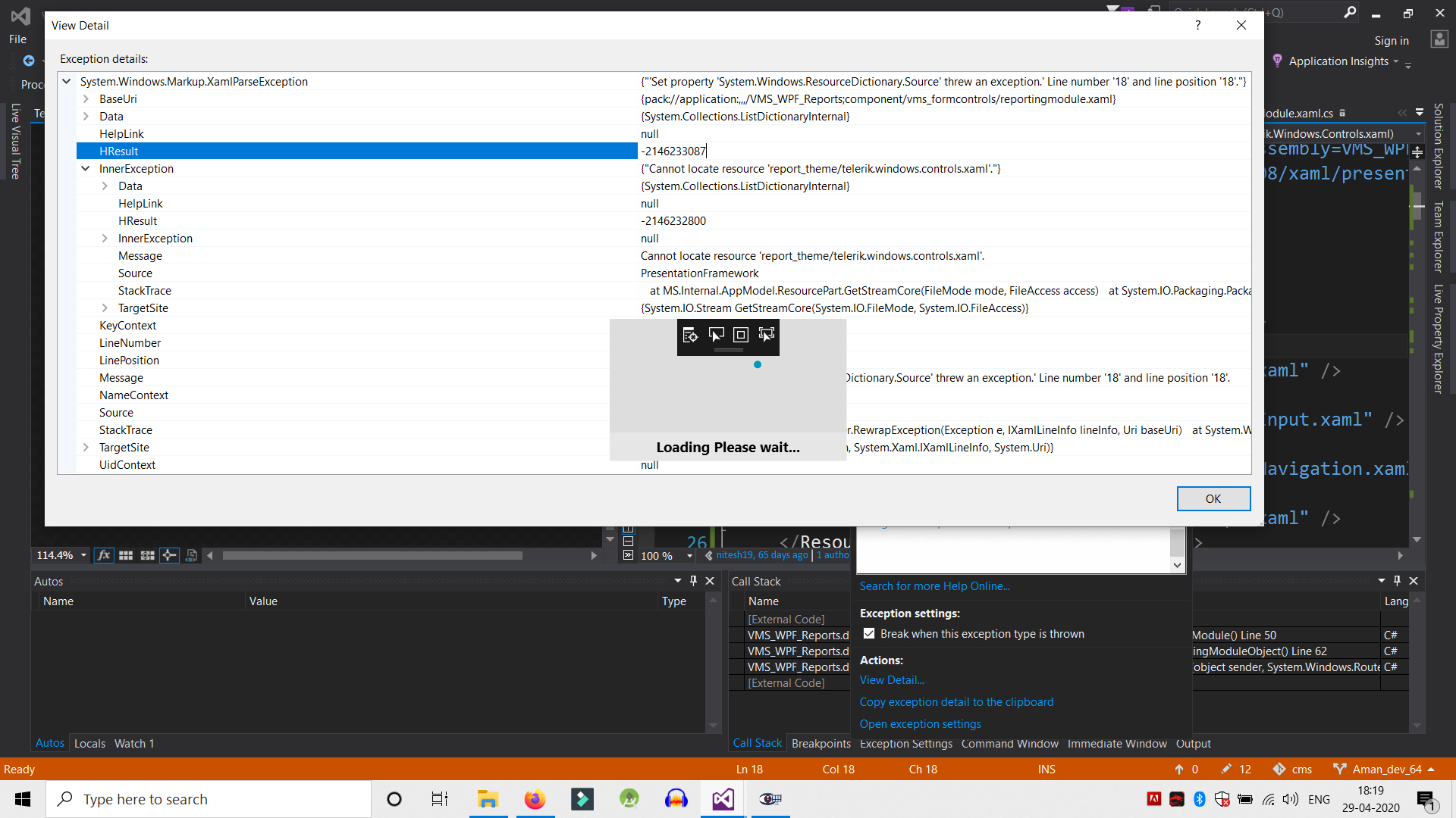 You may test the answer from Reporting Control themes effect my Micrsoft WPF Controls in Project forum post. If this doesn't work, give us more information about the error.