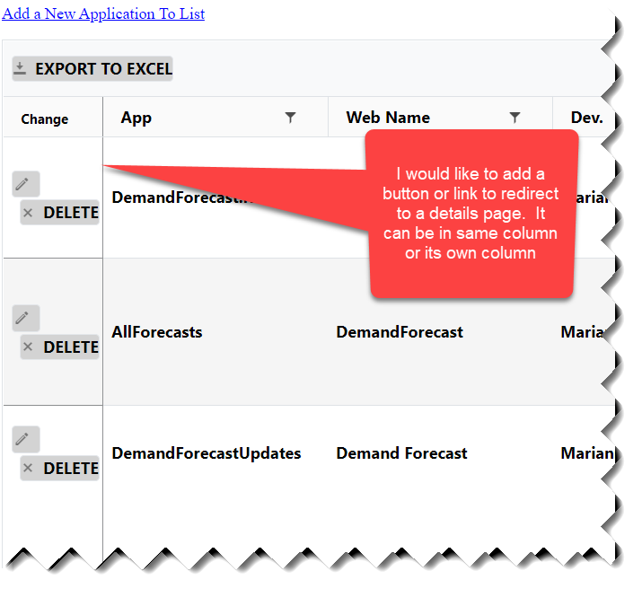 However, now I want to add a button to send a user to a details page for any given row. Since the grid view scrolls horizontally pretty far, I want to give the users an option of viewing a selected row vertically. I planned to just redirect to another page when the user clicked the link or button (by invoking a script to do the work of getting the row id and redirecting to the details.)