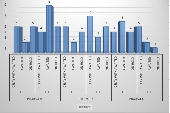 An alternative approach is to add 3 different BarSeries for "Project A", "Project B" and "Project C". In each series, you need to add a data point which category is unique as name combining the names you have, e.g. "A L-0 Awaited", "B L-1 On Hold". Thus, each bar element will be rendered separately since the category names wouldn't be duplicated.