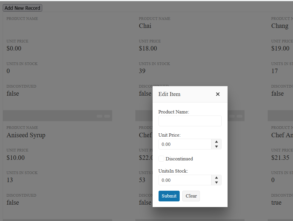 I have a ListView that works very nicely with most of the default behavior as shown below. However, I would like to create a new item in the ListView by using a Popup form. This form could also be used by the edit event if that simplifies the code, but does not have to be the same, and the edit functionality could work as it does now. I have looked at the popup editing feature as described here. However, I could not figure out how to make this work for create as there is no create event on the ListView. Does everything have to work outside the framework of the control, so that the add is using a separate Ajax call and then refreshing the view, or is there a better way to keep this within the structure of the ListView and its events?
