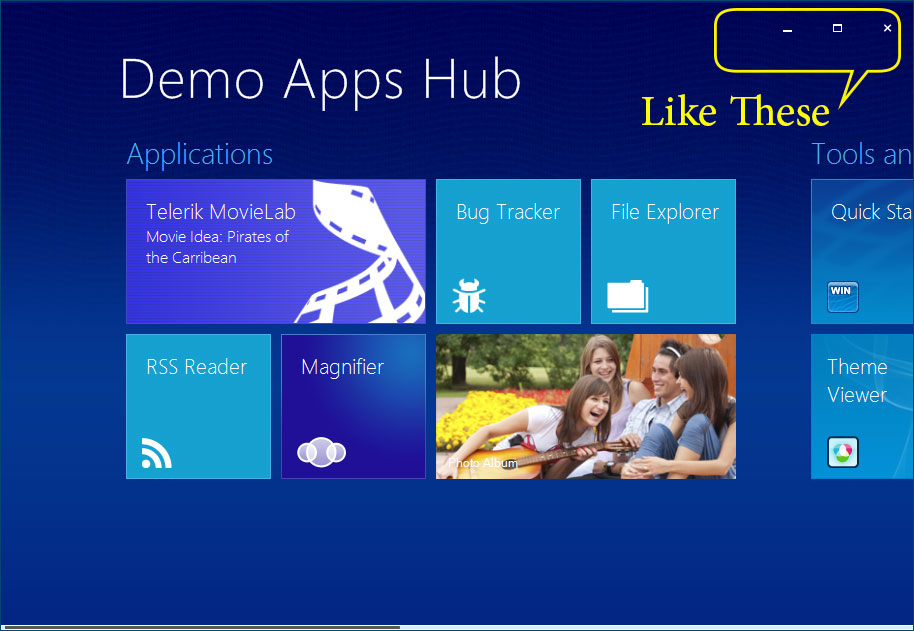 The image which you have sent is from our DemoHub application. You can find useful the PrepareTitleBar() method from our demo. The location where you can find it is: START >> All Programs >> Telerik >> RadControls for WinForms [version] >> Examples >> C# for Visual Studio 2010 >> Open C# DemoHub in Visual Studio - RadControls for WinForms.