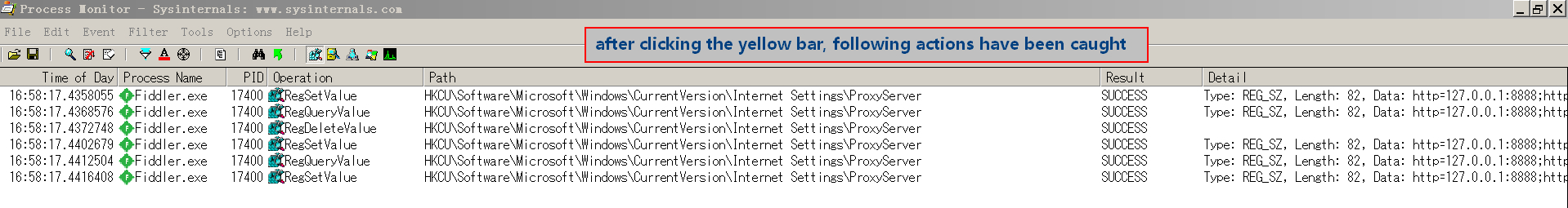 when I click the YELLOW BAR(the system proxy was changed. click to reenable capturing), I find Fiddler does the changes in windows registry and capture it as pic 1.