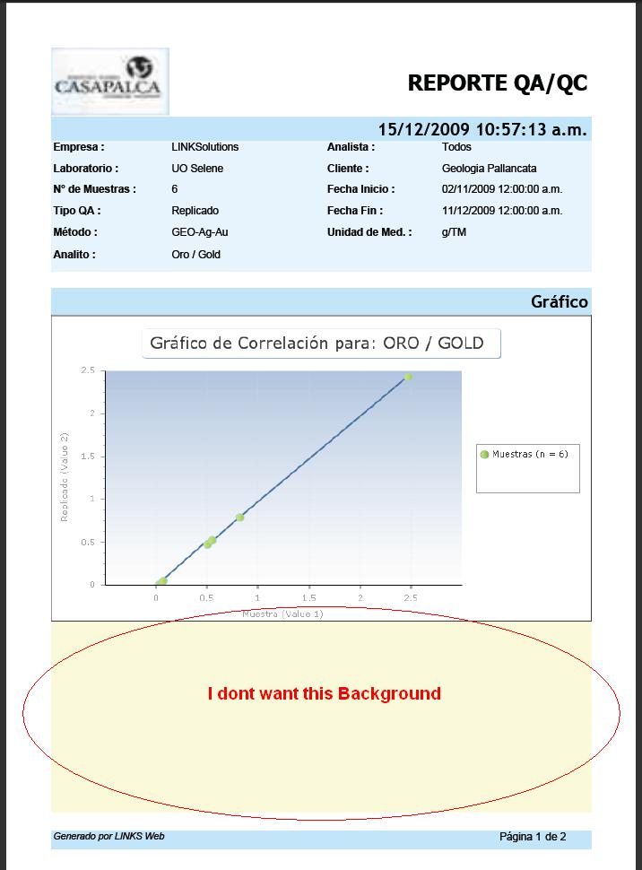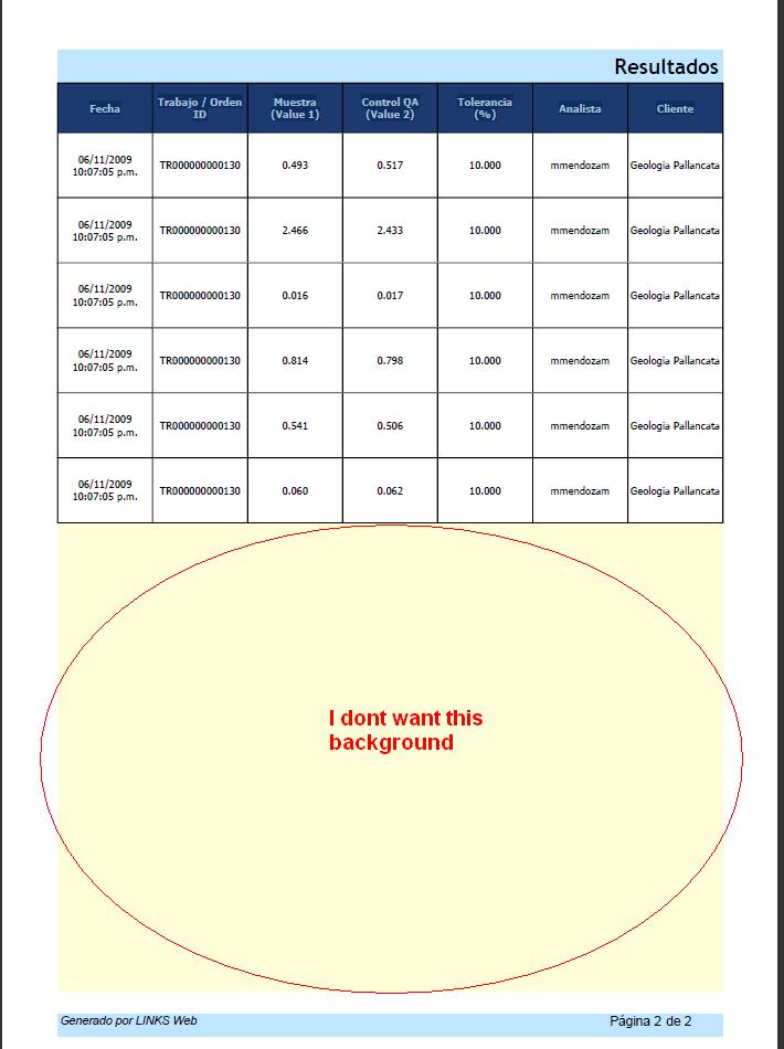 I want that after the Report Header the Details Section shows (i have actived KeepTogether = False, RowHeaderPrintOnEveryPage = true, so if there are too many results the table will continue in the hext page) but the Details section jump to the next page and instead of that there is a yellow background !! T_T. That yellow background appears at second page too when my result table is too short to the complete page. I'll attach the report in pdf.