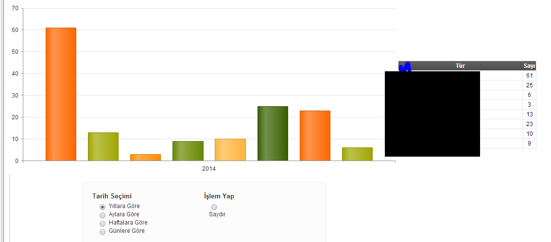 <td> <div align="center" id="MyChart"> @(Html.Kendo().Chart(Model).Name("MyChartz") .Title(title => title .Text("Aaaaa)") .Position(ChartTitlePosition.Top)) .Legend(legend => legend .Visible(true) .Position(ChartLegendPosition.Top)).Series(series =>{ series .Column(model => model.aaa, categoryExpression: model => model.DateTime).Name("aaa Dosyalar") .Aggregate(ChartSeriesAggregate.Count); series .Column(model => model.bbb, categoryExpression: model => model.DateTime).Name("bbb Dosyalar") .Aggregate(ChartSeriesAggregate.Count);}).CategoryAxis(axis => axis .Date() .BaseUnit(ChartAxisBaseUnit.Months) .MajorGridLines(lines => lines.Visible(false))) .Tooltip(tooltip => tooltip .Visible(true) .Template("#= series.name #: #= value #")) ) </div> </td>Script
