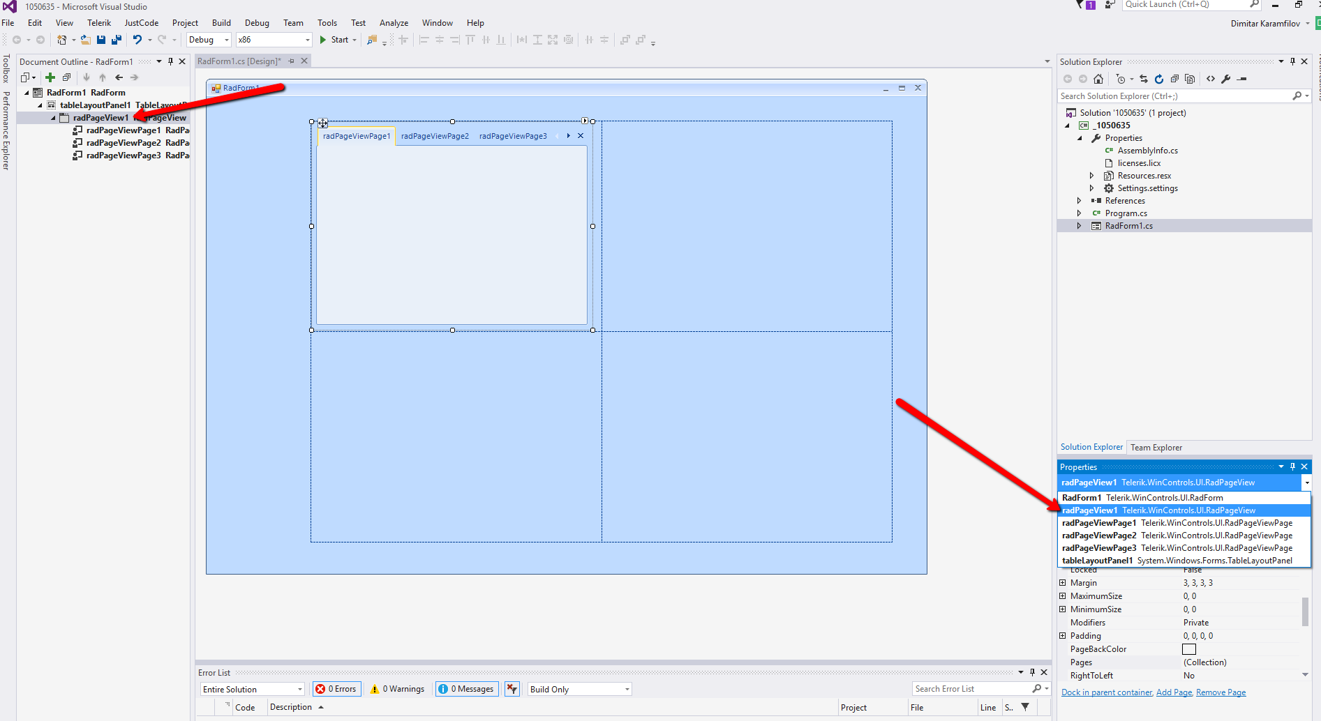 I can't find anyway to bring the pageview I want to work with to the front in the Visual Studio 2015 IDE designer. How can I do this? Is it possible? Telerik version 2013.1.321.20.