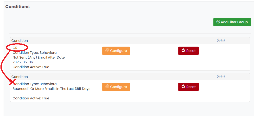 The AND/OR selector is dropped from the first expression and it is visible next to the second condition even though it says AND instead of previously being OR. The user can correct for this AND/OR in the second condition if they can see that it needs to be switched. If they don't see anything (as in screenshot 2) then they don't know that anything needs to be adjusted.