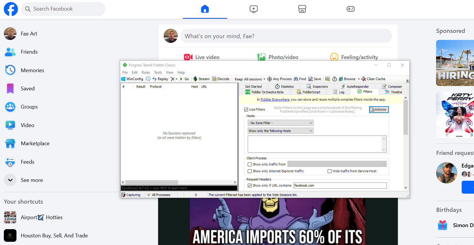 If anyone can please inform me how I can capture all of Facebook's traffic in the session list without any other traffic being captured-thus sparing me the hassle of sorting through the list to identify which traffic belongs to Facebook- that would be great. Otherwise, I see no reason to continue using Fiddler Classic or to subscribe.