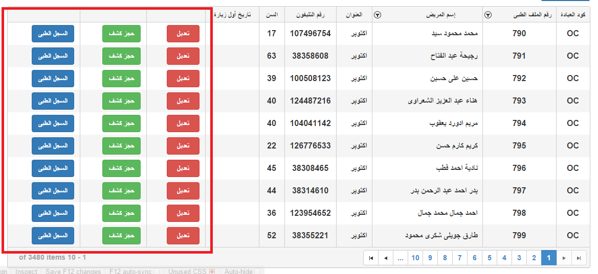 @model IEnumerable<MhafezClinic.Models.DBContext.PTData>@using Microsoft.AspNet.Identity;@using Microsoft.AspNet.Identity.EntityFramework;@using MhafezClinic.Models.DBContext;@using MhafezClinic.Models;@{ ViewBag.Title = "المرضى";}<br /><style> .k-grid-EditData { display: inline-block; padding: 6px 12px; margin-bottom: 0; font-size: 14px; font-weight: bold; line-height: 1.42857143; text-align: center; white-space: nowrap; vertical-align: middle; -ms-touch-action: manipulation; touch-action: manipulation; cursor: pointer; -webkit-user-select: none; -moz-user-select: none; -ms-user-select: none; user-select: none; background-image: none; border: 1px solid transparent; border-radius: 4px; color: #fff; background-color: #d9534f; border-color: #d43f3a; } .k-grid-AddKashf { display: inline-block; padding: 6px 12px; margin-bottom: 0; font-size: 14px; font-weight: bold; line-height: 1.42857143; text-align: center; white-space: nowrap; vertical-align: middle; -ms-touch-action: manipulation; touch-action: manipulation; cursor: pointer; -webkit-user-select: none; -moz-user-select: none; -ms-user-select: none; user-select: none; background-image: none; border: 1px solid transparent; border-radius: 4px; color: #fff; background-color: #5cb85c; border-color: #4cae4c; } .k-grid-PTSheet { display: inline-block; padding: 6px 12px; margin-bottom: 0; font-size: 14px; font-weight: bold; line-height: 1.42857143; text-align: center; white-space: nowrap; vertical-align: middle; -ms-touch-action: manipulation; touch-action: manipulation; cursor: pointer; -webkit-user-select: none; -moz-user-select: none; -ms-user-select: none; user-select: none; background-image: none; border: 1px solid transparent; border-radius: 4px; color: #fff; background-color: #337ab7; border-color: #2e6da4; }</style>@if (User.IsInRole("Manager") | User.IsInRole("DataEntry")){ <p style="font-size: medium;" dir="rtl"> @Html.ActionLink("إضافة مريض", "Create", null, new { @class = "btn btn-primary", @style = "font-size: medium; font-weight:bold" }) </p>}<div class="k-rtl"> @(Html.Kendo().Grid<MhafezClinic.Models.DBContext.PTData>() .Name("SHPTData") .HtmlAttributes(new { style = "font-weight:bold;" }) .Columns(columns => { columns.Bound(e => e.ClinicCode) .ClientTemplate("#=ClinicCode.Clinic_Code_Name#") .Title("كود العيادة") .Sortable(false) .HtmlAttributes(new { @style = "font-size:medium; font-weight:bold; text-align:center; vertical-align:middle" }) .HeaderHtmlAttributes(new { @style = "font-weight:bold; text-align:center;" }).Width(50) .Filterable(false); columns.Bound(e => e.PT_Clinic_ID) .HtmlAttributes(new { @style = "font-size:medium; font-weight:bold; text-align:center; vertical-align:middle" }) .HeaderHtmlAttributes(new { @style = "font-weight:bold; text-align:center;" }).Width(75) .Title("رقم الملف الطبى"); columns.Bound(e => e.PT_Name) .HtmlAttributes(new { @style = "font-size:medium; font-weight:bold; vertical-align:middle" }) .HeaderHtmlAttributes(new { @style = "font-weight:bold; text-align:center;" }) .Title("إسم المريض"); columns.Bound(e => e.PT_Address) .HtmlAttributes(new { @style = "font-size:medium; font-weight:bold; vertical-align:middle" }) .HeaderHtmlAttributes(new { @style = "font-weight:bold; text-align:center;" }).Filterable(false) .Sortable(false) .Title("العنوان"); columns.Bound(e => e.PT_Phone) .HtmlAttributes(new { @style = "font-size:medium; font-weight:bold; text-align:center; vertical-align:middle" }) .HeaderHtmlAttributes(new { @style = "font-weight:bold; text-align:center;" }).Width(100) .Filterable(false).Sortable(false).Title("رقم التليفون"); columns.Bound(e => e.PT_Age) .HtmlAttributes(new { @style = "font-size:medium; font-weight:bold; text-align:center; vertical-align:middle" }) .HeaderHtmlAttributes(new { @style = "font-weight:bold; text-align:center;" }).Width(50) .Filterable(false).Sortable(false).Title("السن"); columns.Bound(e => e.PT_First_Visit_Date) .HtmlAttributes(new { @style = "font-size:medium; font-weight:bold; text-align:center; vertical-align:middle" }) .HeaderHtmlAttributes(new { @style = "font-weight:bold; text-align:center;" }).Width(105) .Filterable(false).Sortable(false).Title("تاريخ أول زيارة"); if (User.IsInRole("DataEntry")) { columns.Command(command => command.Custom("EditData").Text("تعديل").Click("EditData")); columns.Command(command => command.Custom("AddKashf").Text("حجز كشف").Click("EditData")); columns.Command(command => command.Custom("PTSheet").Text("السجل الطبى").Click("EditData")); } else if (User.IsInRole("Manager")) { columns.Command(command => command.Custom("EditData").Text("تعديل").Click("EditData")); columns.Command(command => command.Custom("DeleteData").Text("حذف").Click("EditData")); columns.Command(command => command.Custom("AddKashf").Text("حجز كشف").Click("EditData")); columns.Command(command => command.Custom("PTSheet").Text("السجل الطبى").Click("EditData")); } else if (User.IsInRole("Doctors")) { columns.Command(command => command.Custom("AddKashf").Text("السجل الطبى").Click("EditData")); } }) .Pageable() .Sortable() .Filterable(filterable => filterable .Operators(operators => operators .ForString(str => str.Clear() .StartsWith("يبدء بـ") .IsEqualTo("يساوى") .IsNotEqualTo("لا يساوى") )) .Operators(operators => operators .ForNumber(str => str.Clear() .IsEqualTo("يساوى") .IsNotEqualTo("لا يساوى") .IsGreaterThanOrEqualTo("أكبر من أو يساوى") .IsGreaterThan("أكبر من") .IsLessThanOrEqualTo("أقل من أو يساوى") .IsLessThan("أقل من") )) .Messages(m => m.And("و") .Or("أو") .Filter("بحث") .Clear("إلغاء") .Info("حدد فلتر البحث الذى تريده")) ) .Editable(editable => editable.Mode(GridEditMode.PopUp)) .DataSource(source => source.Ajax() .Model(model => { model.Id(e => e.PT_ID); model.Field(e => e.PT_ID).Editable(false); }) .Events(events =>
