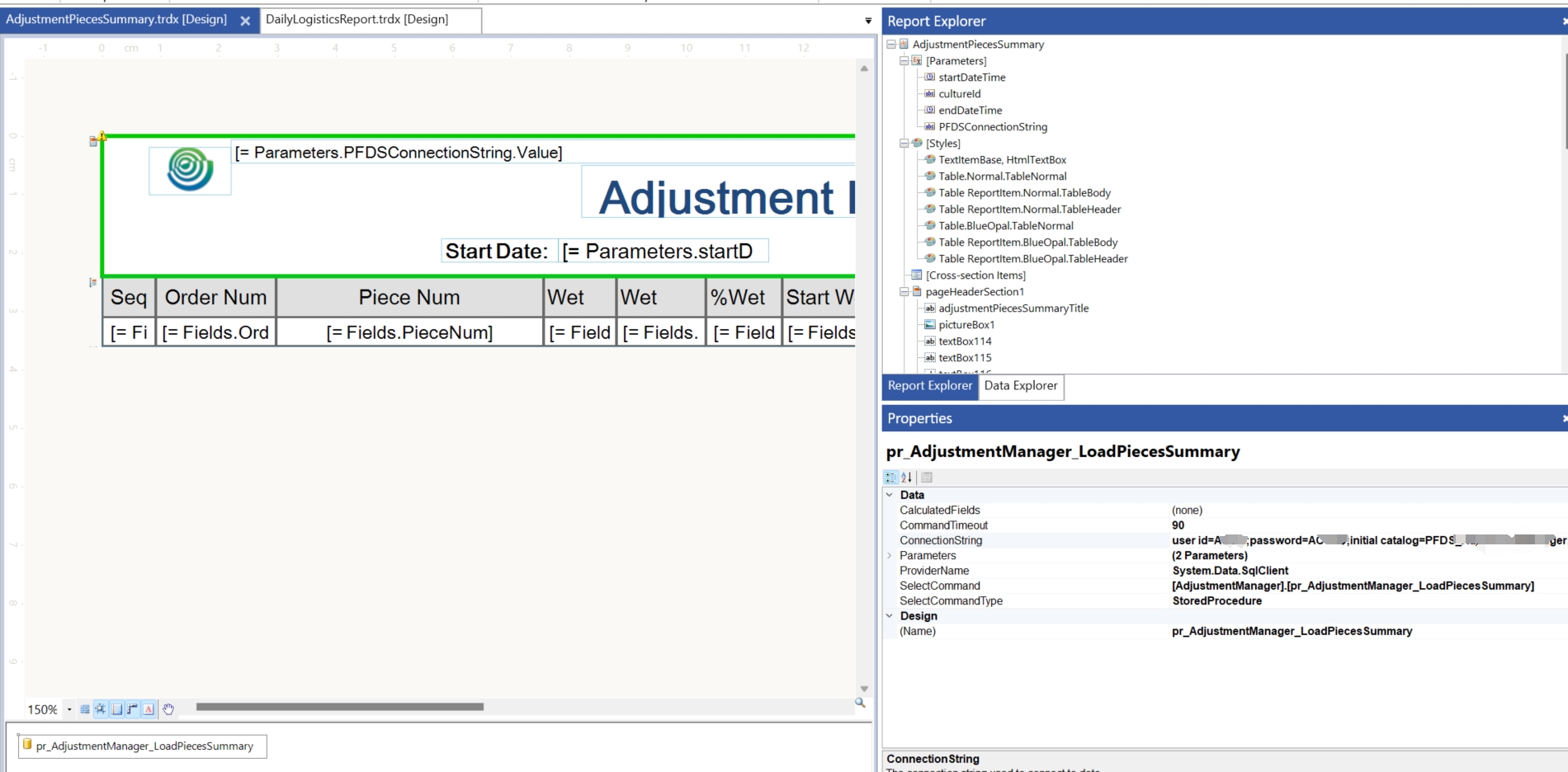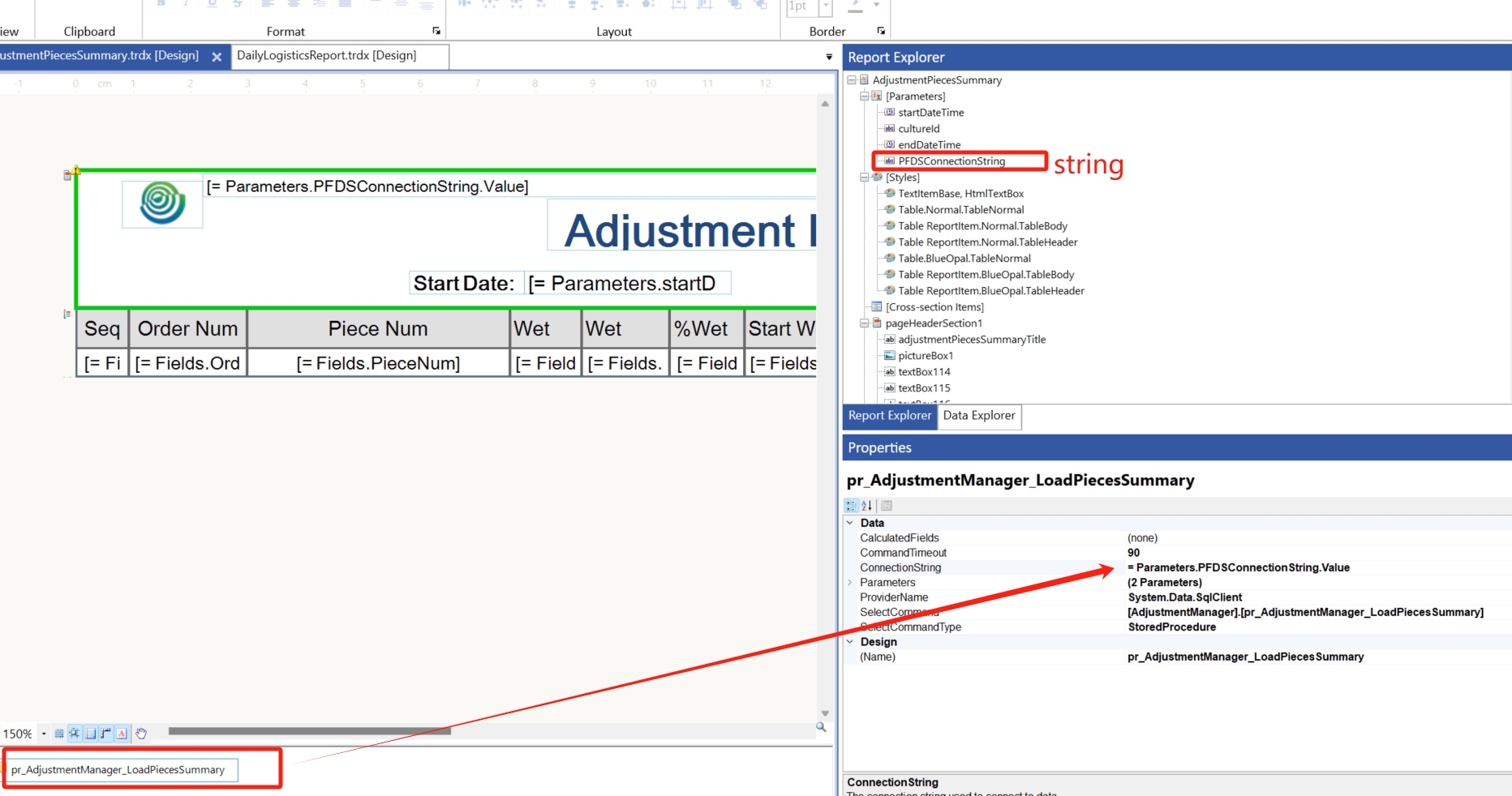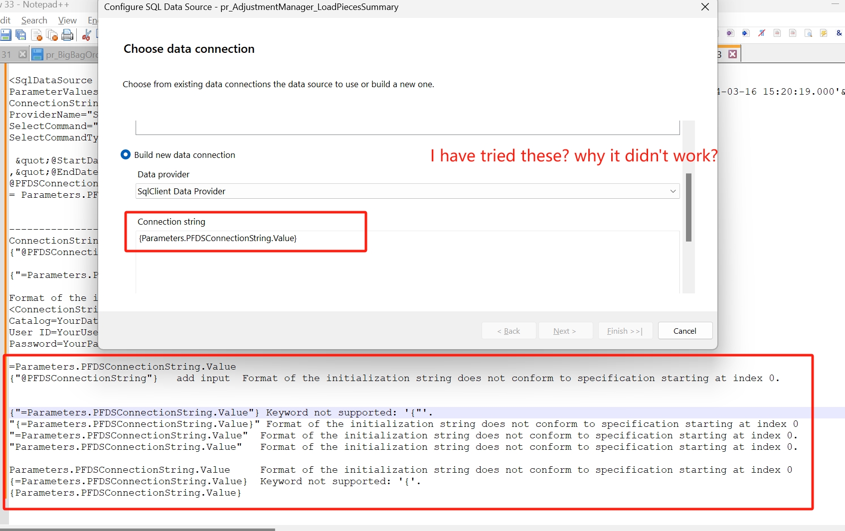 But when I set the connection string to the property 'ConnectionString' , it worked. And I tested the parameter rendering, it's also OK. Pls refer the success.png.