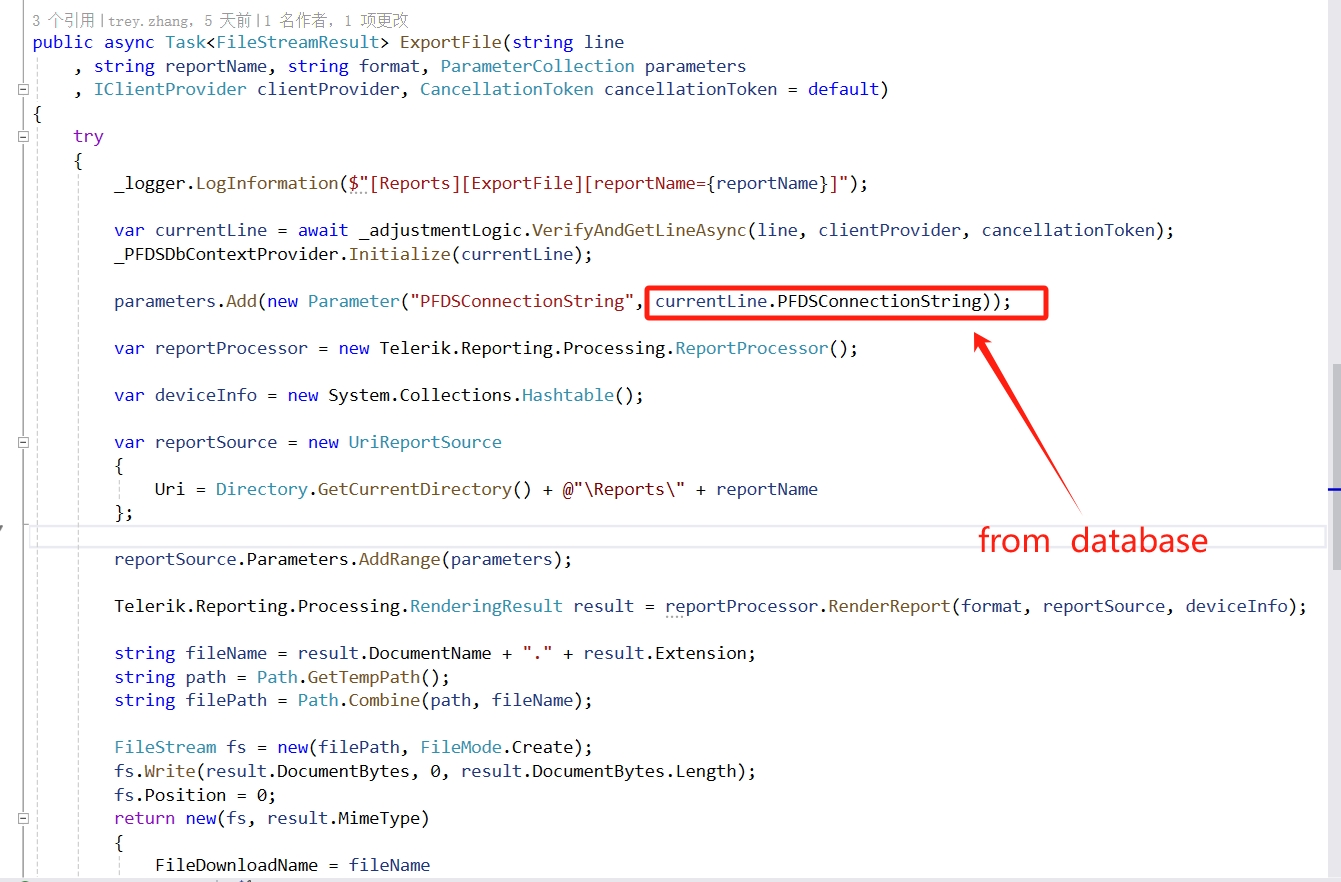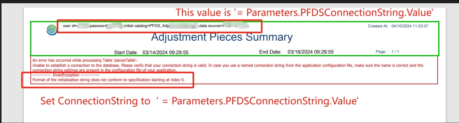 Maybe you want me refer Assign connection string dynamically using report parameter and bindings - Telerik Reporting .I followed the solution, it didn't work . And then I set the 'ConnectionString' to '@ReportParameters.PFDSConnectionString', it also didn't work, even if I add the '.Value'.Pls refer the error.png