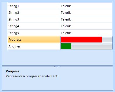 I suppose that you would like to change the color of ProgressBarElement within a custom PropertyGridItem. Please refer to the following code snippet that demonstrates how you can achieve this: