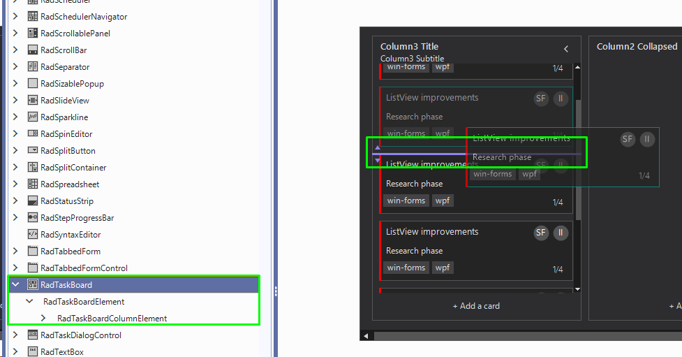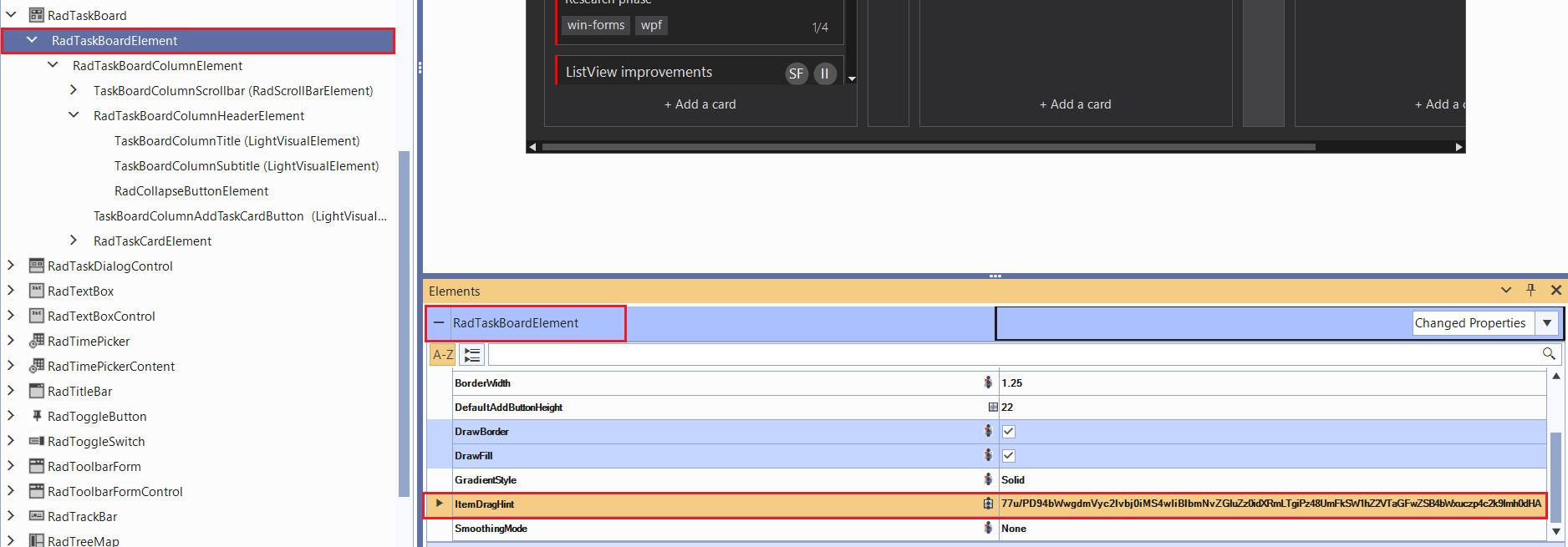 Hi, how can I change the RadTaskBoard drag and drop fill color? I would like to set it to teal for example rather purple. I believe that will fix a problem in my RadGridView when in Drag and Drop mode as well.