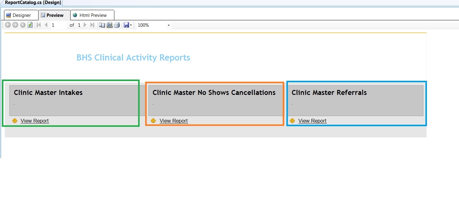 1) Client Master Referrals 2) Client Master Intakes 3) Client Master No Show Cancellations