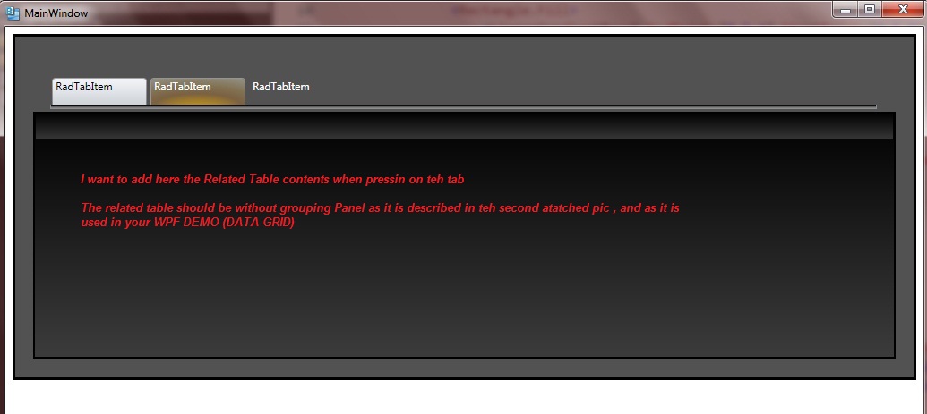 - Telerik_WPFControls_Demo_DataGrid (Attached Image which describes how is related tables are used via TabControl in your WPF Demo Application)