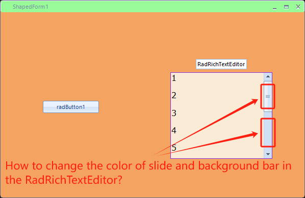 I'm currently working with the RadRichTextEditor control in my C# WinForms application, and I need to customize the colors of the slide and background bar. Could someone guide me on the steps to change these colors? Additionally, if there's a way to achieve this directly through code, I'd greatly appreciate it if you could share a code snippet.