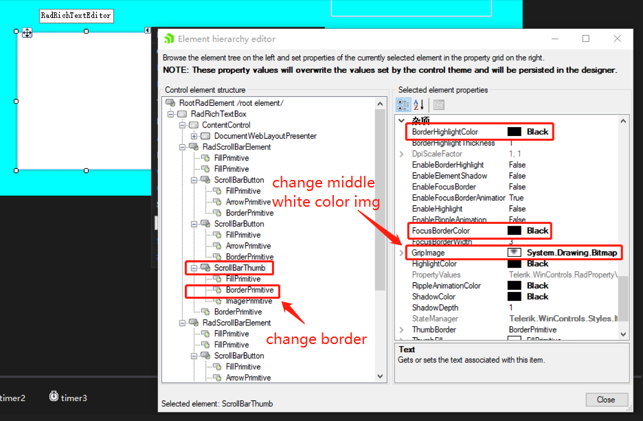 By modifying the properties of the RadRichTextEditor, I was able to successfully change the border color of the ScrollBarThumb. Additionally, the Grip Image can be adjusted to modify the image displayed in the middle of the thumb. Moreover, you can reset the Grip Image in the code with a single line: this.radRichTextEditor1.RichTextBoxElement.VerticalScrollBar.ThumbElement.GripImage = null;.