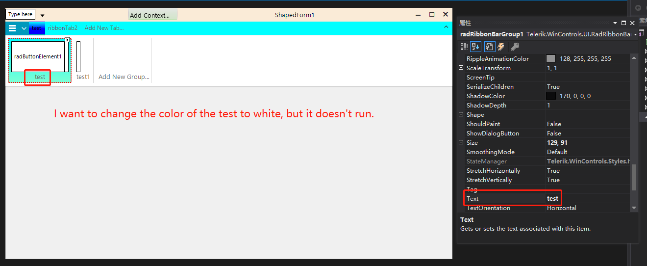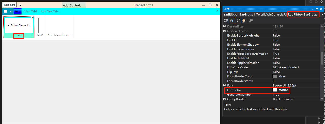 I have create the RadRibbonBarGroup in RadRibbonBar. But I want to change the font color in RadRibbonBarGroup, I change the ForeColor to white. It doesn't change the color. It always shows gray color. Please tell how to change the font 'test' color, thanks very much.