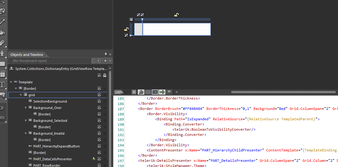 <Grid x:Name="LayoutRoot" Background="White" DataContext="{Binding Source={StaticResource SampleDataSource}}"> <Grid.Resources> <Style x:Key="style1" TargetType="telerik:GridViewHeaderCell"> <Setter Property="Background" Value="Red"/> <Setter Property="BorderThickness" Value="0"/> </Style> </Grid.Resources> <telerik:RadGridView Margin="40,24,88,72" ItemsSource="{Binding Collection}"> <telerik:RadGridView.Columns> <telerik:GridViewDataColumn Header="EmployeeName" HeaderCellStyle="{StaticResource style1}" DataMemberBinding="{Binding Property3}"/> </telerik:RadGridView.Columns> </telerik:RadGridView> </Grid>You may notice that this simple style changes only the outer border of GridViewHeaderCell, if you need to change its inner border you have to edit its template, this rule is valid for most RadGridView's parts.