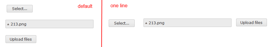 The following layout is not supported out of the box. Nevertheless you could manually specify some custom CSS styles and float the Upload widget elements in order to achieve it. Here is a JS Bin example, which demonstrates this.