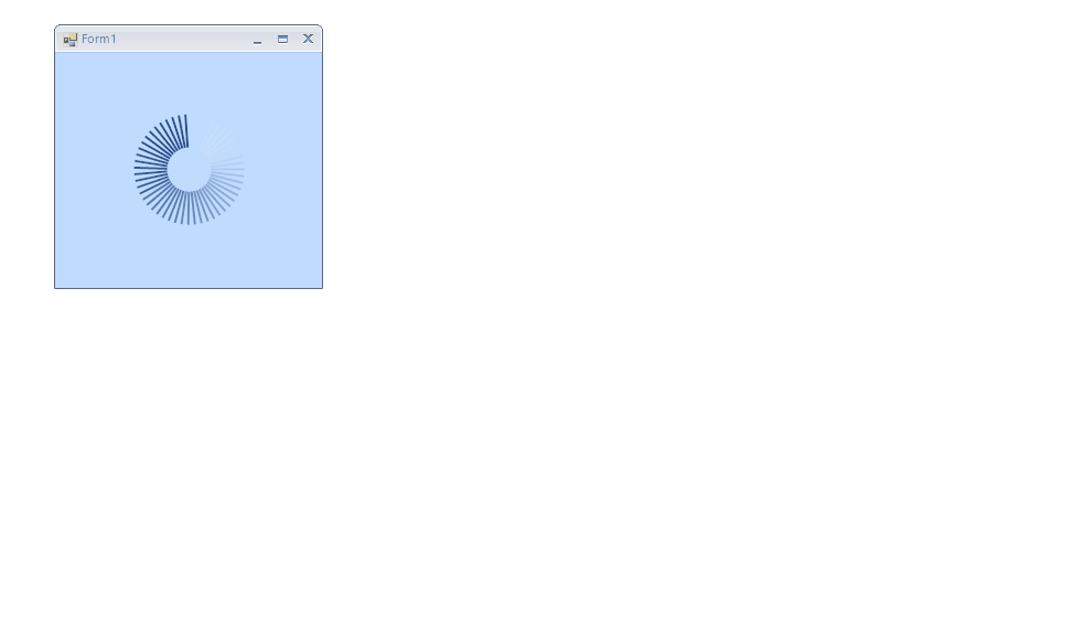 public RadForm1(){ InitializeComponent(); LineRingWaitingBarIndicatorElement indicator = this.radWaitingBar1.WaitingIndicators[0] as LineRingWaitingBarIndicatorElement; indicator.Radius = 50; indicator.InnerRadius = 20; indicator.ElementCount = 48; this.radWaitingBar1.StartWaiting(); this.radWaitingBar1.Dock = DockStyle.Fill;}I hope this helps. If you need any further assistance please don't hesitate to contact me.