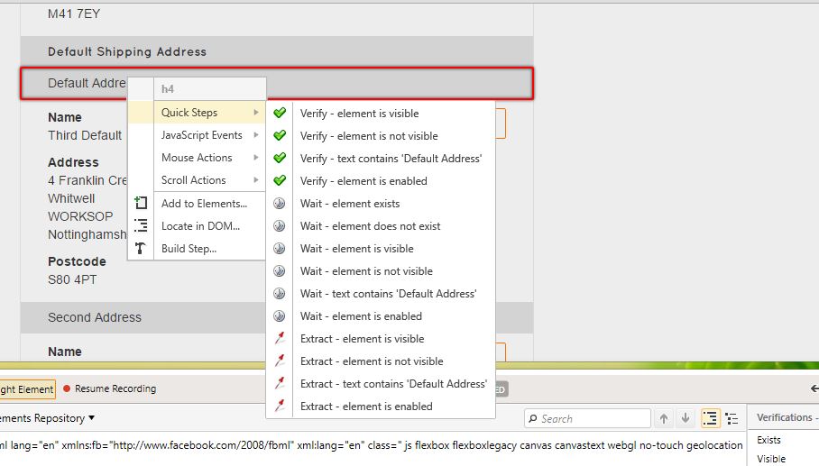 You were actually on the right path by highlighting the element when it was visible and selecting a verification for is not visible. But instead of verifying is not visible you should select verify does not exist. The problem you're running into is that verify is visible or is not visible is looking at the visibility property of the element and needs the element to exist so it can verify the property. But in your case the element is actually removed from the browser's Dom, it no longer exists. So setting up a verify element does not exist is the correct way to verify the address has been deleted.