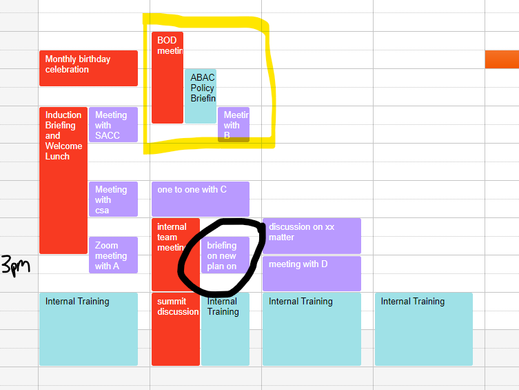 and for the circled in black part, may i know how to show the overflow title of the event and let the whole row to adapt to the event of the particular row. For instance, if the "briefing on new plan on ...." event's overflow:visible and height:max-content, the height will increase, the row of "3pm" should increase and adapt to the height of the event, to be sth like this to_sth_like_this.png