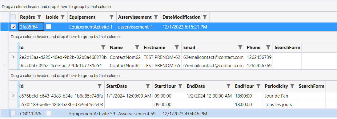 With this being said, my suggestion would be to use two RadGridView controls, one for the Contacts and one for the Timetables collections. This will produce the following result when such a layout is configured using the sample application that you provided: