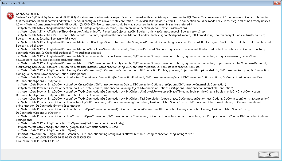 The error message you are getting is that the server is not accessible, which is not Test Studio related problem, you either use the wrong connection string or your SQL server does not allow remote connection.