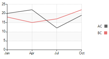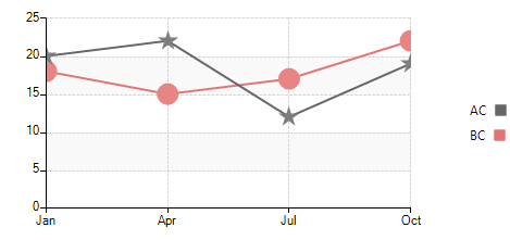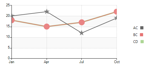 LineSeries lineSeries = new LineSeries(); lineSeries.LegendTitle = "AC"; lineSeries.DataPoints.Add(new CategoricalDataPoint(20, "Jan")); lineSeries.DataPoints.Add(new CategoricalDataPoint(22, "Apr")); lineSeries.DataPoints.Add(new CategoricalDataPoint(12, "Jul")); lineSeries.DataPoints.Add(new CategoricalDataPoint(19, "Oct")); this.radChartView1.Series.Add(lineSeries); LineSeries lineSeries2 = new LineSeries(); lineSeries2.LegendTitle = "BC"; lineSeries2.DataPoints.Add(new CategoricalDataPoint(18, "Jan")); lineSeries2.DataPoints.Add(new CategoricalDataPoint(15, "Apr")); lineSeries2.DataPoints.Add(new CategoricalDataPoint(17, "Jul")); lineSeries2.DataPoints.Add(new CategoricalDataPoint(22, "Oct")); this.radChartView1.Series.Add(lineSeries2); LineSeries lineSeries3 = new LineSeries(); lineSeries3.LegendTitle = "CD"; lineSeries3.DataPoints.Add(new CategoricalDataPoint(18, "Jan")); lineSeries3.DataPoints.Add(new CategoricalDataPoint(15, "Apr")); lineSeries3.DataPoints.Add(new CategoricalDataPoint(17, "Jul")); lineSeries3.DataPoints.Add(new CategoricalDataPoint(22, "Oct")); this.radChartView1.Series.Add(lineSeries3); this.radChartView1.ShowGrid = true; this.radChartView1.ShowLegend = true; lineSeries.Shape = new StarShape(); lineSeries.PointSize = new SizeF(20, 20); lineSeries2.Shape = new CircleShape(); lineSeries2.PointSize = new SizeF(20, 20); lineSeries.BorderWidth = 2; lineSeries2.BorderWidth = 2; lineSeries3.BorderWidth = 4;}4. You can specify what shape to be used in the LineSeries by setting the LineSeries. Shape property and adjusting the PointSize: