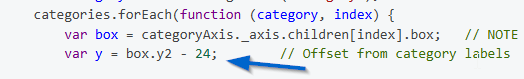 For the legend edges, there is a legend.item.markers.visual that can be used to create a custom visual for the markers, which has this kendo demo. However, when I removed type: "line" to make it a bar chart , the visual did not get invoked (dojo). I don't see anything that says the visual is limited to line type charts, but perhaps Nikolay can comment on that.