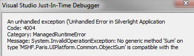 Get the error:No generic method 'Sum' on type 'MSHF.Paris.UIPlatform.Common.ObjectSum' is compatible with the", because it is a Just-In-Time Debugger dialog, the message is trucated.