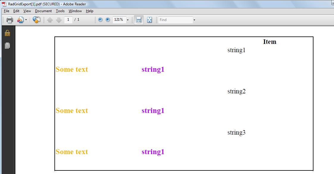 <telerik:RadGrid ID="RadGrid1" runat="server" GridLines="None" Width="745px" AutoGenerateColumns="False" OnNeedDataSource="RadGrid1_NeedDataSource"> <ExportSettings OpenInNewWindow="true" /> <MasterTableView AutoGenerateColumns="true" CommandItemDisplay="Top" CommandItemSettings-ShowExportToPdfButton="true"> <Columns> <telerik:GridTemplateColumn> <ItemTemplate> <h3 style="font: bold 14px Arial, Helvetica, sans-serif; color: #f1b607; padding: 20px 20px 10px 20px; margin: 0;"> Some text </h3> </ItemTemplate> </telerik:GridTemplateColumn> <telerik:GridTemplateColumn> <ItemTemplate> <h3 style="font: bold 10px Arial, Helvetica, sans-serif; color: #b607f1; padding: 20px 20px 10px 20px; margin: 0;"> <%# strings[0] %> </h3> </ItemTemplate> </telerik:GridTemplateColumn> </Columns> </MasterTableView></telerik:RadGrid>public string[] strings = new string[] { "string1", "string2", "string3" };protected void RadGrid1_NeedDataSource(object sender, Telerik.Web.UI.GridNeedDataSourceEventArgs e){ RadGrid1.DataSource = strings;}Try it out and let me know how it works with you and what differs in your case.