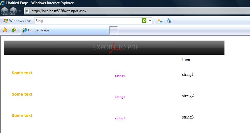 Thanks for sending me the sample code. It worked fine to an extent except that it is not taking the font (arial / verdana etc) and the alignment is not proper in the pdf when compared to web page. I have attached the screenshot of the webpage and pdf for you to view. Please let me know how to tackle the font and alignment issue meanwhile I will try to find the error in my inline style.
