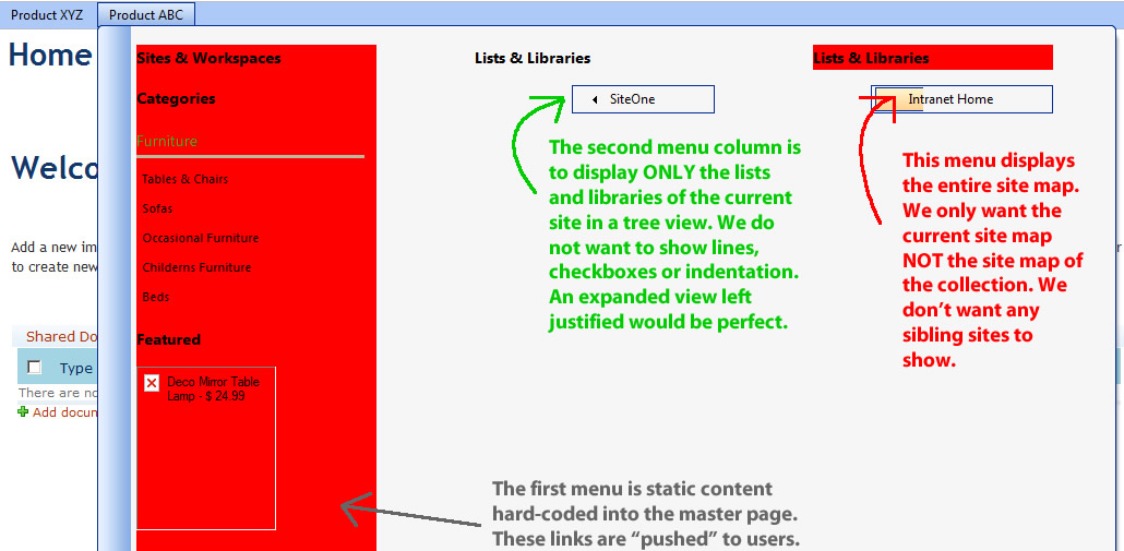 We are creating a dynamic menu using a Mega Nav, a multi-column display and static menus. One of the columns holds a drop-down menu which we want to display the LISTS and LIBRARIES for the current SharePoint 2010 site. We want to have no other menu items displayed in this particular drop-down. Can someone help us how to get the results we are looking for? We have been attempting to use the SITEMAPDATASOURCE, however, this returns the entire site map structure which is way too much information. Based on which site a user is at this drop-down menu will only display the lists and libraries for that site only. It would dynamically look at the parent and children in the hierarchy and display the current location. While we believe this is the correct path we don't know the proper steps to code it correctly.