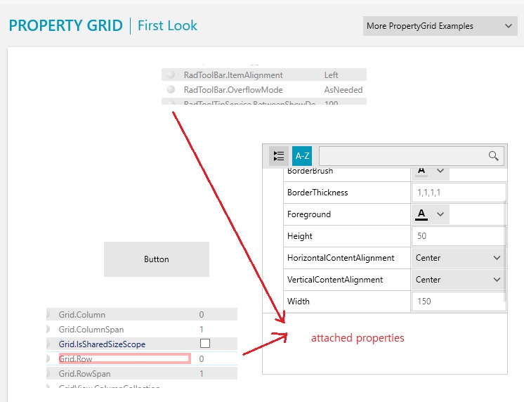 RadPropertyGrid doesn't support attached properties. You can log a feature request in the feedback portal if you think that this should be included in the control.