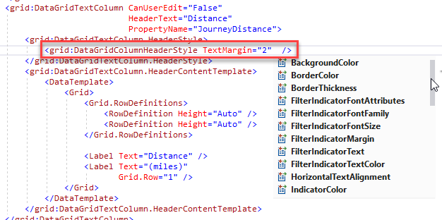 <grid:DataGridTextColumn CanUserEdit="False" PropertyName="JourneyDistance"> <grid:DataGridTextColumn.HeaderContentTemplate> <DataTemplate> <Grid> <Grid.RowDefinitions> <RowDefinition Height="Auto" /> <RowDefinition Height="Auto" /> </Grid.RowDefinitions> <Label Text="Distance" /> <Label Text="(miles)" Grid.Row="1" /> </Grid> </DataTemplate> </grid:DataGridTextColumn.HeaderContentTemplate></grid:DataGridTextColumn>The last snippet runs without error but the header is just empty