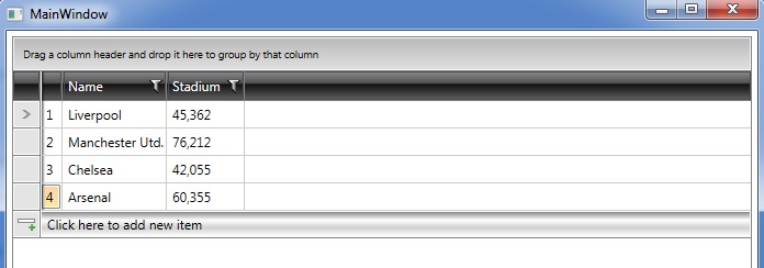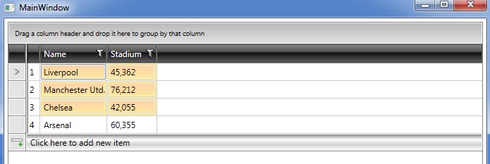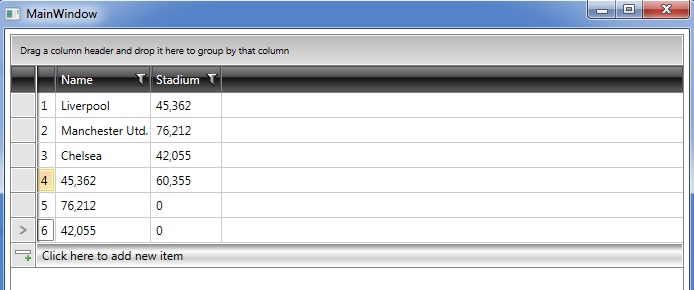 3. Indeed, the initial implementation of the example is not intended to be used in conjunction with the NewRowPosition mechanism. For your convenience, I prepared a modified version of the demo with a possible solution. Basically, it consists of utilizing the AddingNewDataItem event of the control and adding an additional boolean property in the view model. When the user clicks to add a new item, the aforementioned event is triggered and in the event handler the boolean property is set to true. Then, depending on the property value, the Text of the TextBlock element within the cell of the custom column is set. Also, the boolean property in the view model is set back to false. Can you please check out the implementation?