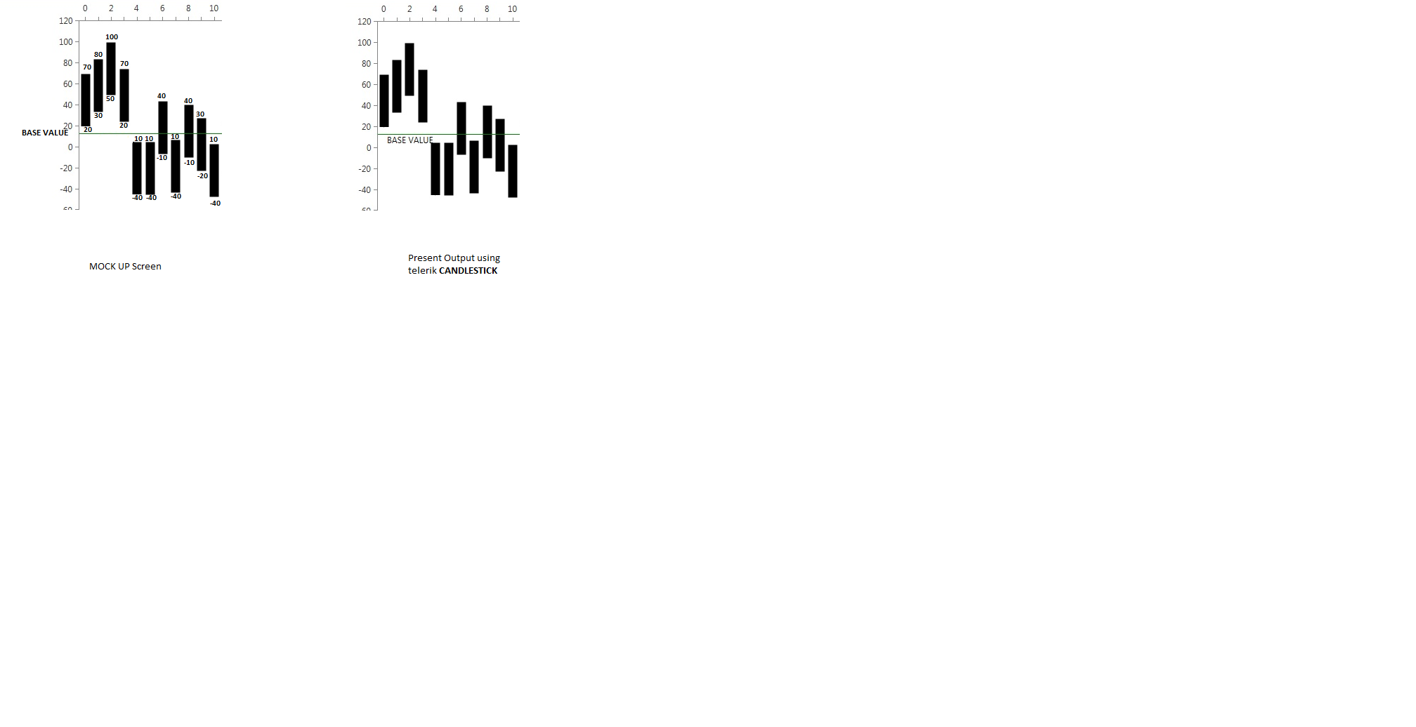 <telerik:RadCartesianChart x:Name="xCartesianChart" Height="300" Width="400" Palette="Windows8" > <telerik:RadCartesianChart.VerticalAxis> <telerik:LinearAxis x:Name="verticalAxis" HorizontalLocation="Left"/> </telerik:RadCartesianChart.VerticalAxis> <telerik:RadCartesianChart.HorizontalAxis > <telerik:CategoricalAxis VerticalLocation="Top" LineThickness="1" LabelInterval="2" ShowLabels="True"/> </telerik:RadCartesianChart.HorizontalAxis> <telerik:CandlestickSeries x:Name="xCandleStick" CategoryBinding="XValue" LowBinding="YValue2" HighBinding="YValue" CloseBinding="YValue2" OpenBinding="YValue" ShowLabels="True"/> <telerik:RadCartesianChart.Annotations> <telerik:CartesianGridLineAnnotation Axis="{Binding ElementName=verticalAxis}" Label="BASE VALUE" Value="13" Stroke="Green"> <telerik:CartesianGridLineAnnotation.LabelDefinition> <telerik:ChartAnnotationLabelDefinition Location="Left" VerticalAlignment="Top" VerticalOffset="0" HorizontalOffset="80"/> </telerik:CartesianGridLineAnnotation.LabelDefinition> </telerik:CartesianGridLineAnnotation> </telerik:RadCartesianChart.Annotations> </telerik:RadCartesianChart>//Code-behind public MainWindow() { InitializeComponent(); PopulateCartesianChart(); } void PopulateCartesianChart() { Random rnd = new Random(); List<ChartDataClass> chartDatas = new List<ChartDataClass>(); for (int i = 0; i < 20; i++) { ChartDataClass cdc = new ChartDataClass(); cdc.XValue = i; cdc.YValue = rnd.NextDouble() * 100; cdc.YValue2 = cdc.YValue - 50; chartDatas.Add(cdc); } xCartesianChart.Series[0].ItemsSource = chartDatas; }Thanks in Advance :)
