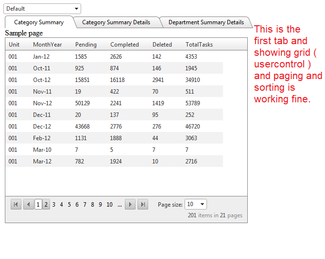 but usercontrols inside 2nd and 3rd tabs showing grid but sorting and paging not working. ( Cannot see grids in 2nd & 3rd tabs )