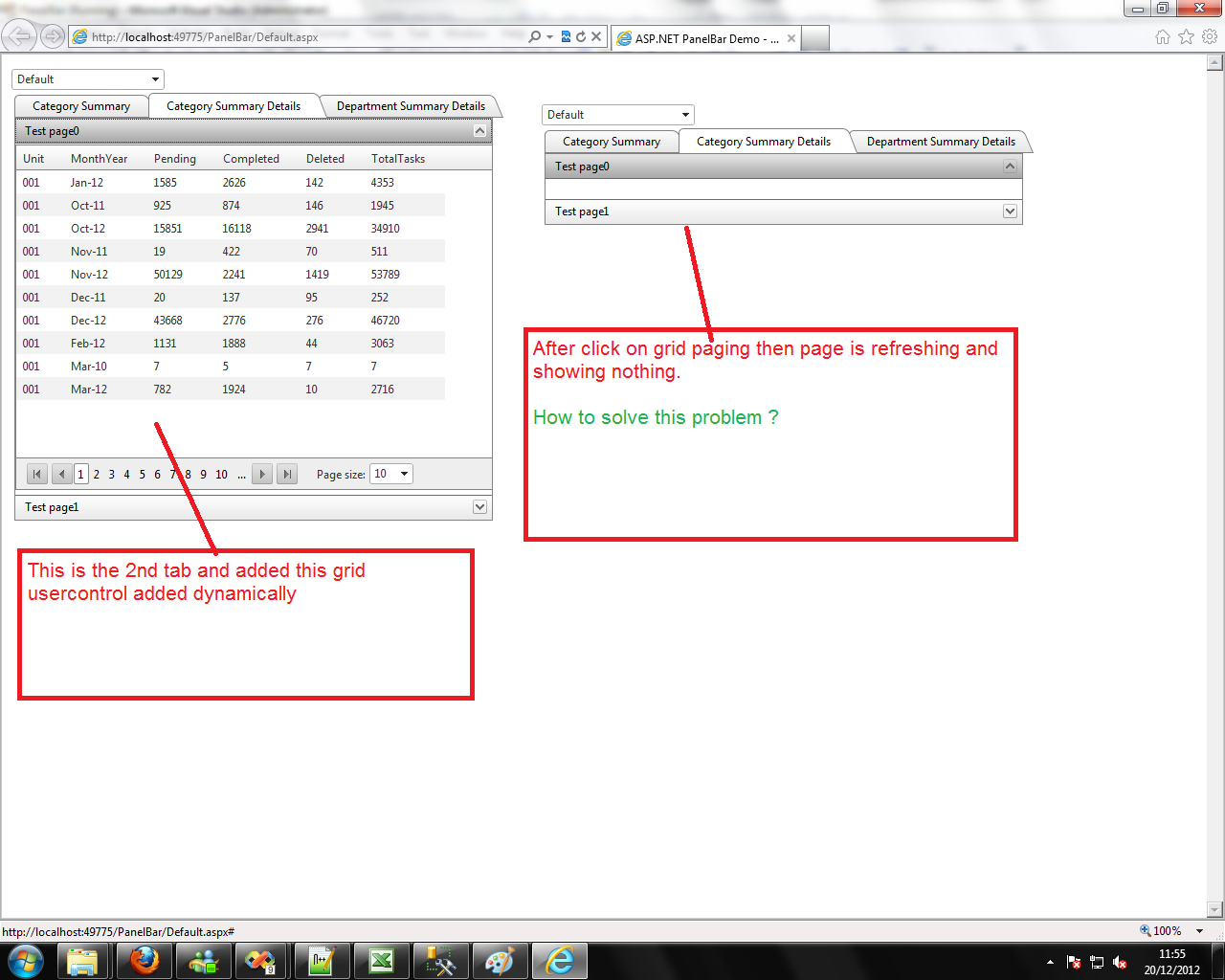 ' Already added in aspx page ( not a dynamic one ) ElseIf RadTabStrip1.SelectedIndex = 1 Then Dim i As Integer = 0 pnlBarCatSummDetails.Items.Clear() Do While (i < 2) Dim dateItem As New RadPanelItem() dateItem.Text = "Test page" + i.ToString() pnlBarCatSummDetails.Items.Add(dateItem) Dim control As New RadPanelItem() Dim Panel1 As New Panel() Dim myControl As Control = LoadControl("CategorySummary.ascx") Panel1.Controls.Add(myControl) control.Controls.Add(Panel1) dateItem.Items.Add(control) i = i + 1 Loop ElseIf RadTabStrip1.SelectedIndex = 2 Then Dim i As Integer = 0 pnlBarDeptSummDetails.Items.Clear() Do While (i < 2) Dim dateItem As New RadPanelItem() dateItem.Text = "Dept Test page" + i.ToString() pnlBarDeptSummDetails.Items.Add(dateItem) Dim control As New RadPanelItem() Dim Panel1 As New Panel() Dim myControl As Control = LoadControl("DepartmentSummary.ascx") Panel1.Controls.Add(myControl) control.Controls.Add(Panel1) dateItem.Items.Add(control) i = i + 1 Loop End If End SubEach user control have grids and bind using sqldatasource wizard.
