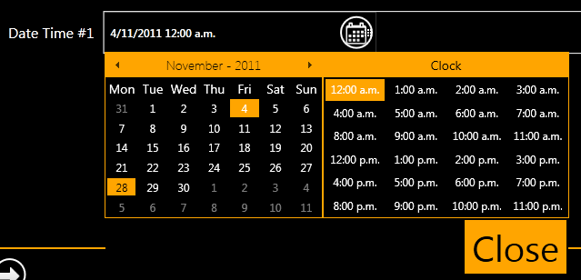 <Window.Resources> <Style x:Key="RadClockItemStyle" TargetType="telerik:RadClockItem" BasedOn="{StaticResource {telerik:ThemeResourceKey ThemeType=telerik:MetroTheme, ElementType=telerik:RadClockItem}}"> <Setter Property="FontSize" Value="40" /> <Setter Property="FontFamily" Value="Segoe UI" /> </Style> <Style x:Key="ClockStyle" TargetType="telerik:RadClock" BasedOn="{StaticResource {telerik:ThemeResourceKey ThemeType=telerik:MetroTheme, ElementType=telerik:RadClock}}"> <Setter Property="ItemContainerStyle" Value="{StaticResource RadClockItemStyle}" /> <Setter Property="FontFamily" Value="Segoe UI" /> <Setter Property="FontSize" Value="40" /> <Setter Property="SnapsToDevicePixels" Value="True" /> </Style> <Style x:Key="CalendarViewStyle" TargetType="input:CalendarView" BasedOn="{StaticResource {telerik:ThemeResourceKey ThemeType=telerik:MetroTheme, ElementType=input:CalendarView}}"> <Setter Property="FontSize" Value="40" /> </Style> <Style x:Key="CalendarButtonStyle" TargetType="input:CalendarButton" BasedOn="{StaticResource {telerik:ThemeResourceKey ThemeType=telerik:MetroTheme, ElementType=input:CalendarButton}}"> <Setter Property="FontSize" Value="40" /> </Style> <Style x:Key="CalendarStyle" TargetType="telerik:RadCalendar" BasedOn="{StaticResource {telerik:ThemeResourceKey ThemeType=telerik:MetroTheme, ElementType=telerik:RadCalendar}}"> <Setter Property="AreWeekNumbersVisible" Value="False" /> <Setter Property="FontSize" Value="40" /> <Setter Property="MonthViewStyle" Value="{StaticResource CalendarViewStyle}" /> <Setter Property="YearViewStyle" Value="{StaticResource CalendarViewStyle}" /> <Setter Property="DecadeViewStyle" Value="{StaticResource CalendarViewStyle}" /> <Setter Property="CenturyViewStyle" Value="{StaticResource CalendarViewStyle}" /> <Setter Property="DayButtonStyle" Value="{StaticResource CalendarButtonStyle}" /> <Setter Property="MonthButtonStyle" Value="{StaticResource CalendarButtonStyle}" /> <Setter Property="YearButtonStyle" Value="{StaticResource CalendarButtonStyle}" /> <Setter Property="DecadeButtonStyle" Value="{StaticResource CalendarButtonStyle}" /> </Style> <Style x:Key="MediumDateTimeStyle" TargetType="{x:Type telerik:RadDateTimePicker}" BasedOn="{StaticResource {telerik:ThemeResourceKey ThemeType=telerik:MetroTheme, ElementType=telerik:RadDateTimePicker}}"> <Setter Property="FontSize" Value="40" /> </Style> </Window.Resources> <Grid x:Name="LayoutRoot"> <telerik:RadDateTimePicker x:Name="KernDateTimePicker" VerticalAlignment="Top" HorizontalAlignment="Left" Width="200" Margin="30" CalendarStyle="{StaticResource CalendarStyle}" ClockStyle="{StaticResource ClockStyle}" Style="{StaticResource MediumDateTimeStyle}" InputMode="DateTimePicker" /> </Grid>The second and the more common thing you can do, is to take all styles and resources for the metro theme and modify the font size manually. You will find the resources in the RadControls installation folder on your machine, then Themes folder. You can drill down to the DateTimePicker.xaml file that corresponds to the Metro theme and copy the resources from this resource dictionary.