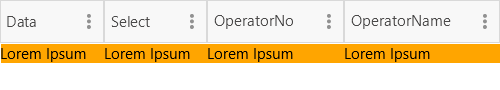 public partial class MainPage : ContentPage{ private readonly BaseViewModel viewModel; public MainPage() { InitializeComponent(); viewModel = new BaseViewModel(); BindingContext = viewModel; SetUpDataGrid(); } private void SetUpDataGrid() { grid_Source.AutoGenerateColumns = false; grid_Source.SelectionUnit = DataGridSelectionUnit.Row; grid_Source.SelectionStyle = new DataGridBorderStyle { BackgroundColor = Color.Orange, BorderColor = Color.Orange, BorderThickness = new Thickness(2) }; var properties = typeof(DataValue).GetProperties(); foreach (PropertyInfo property in properties) { grid_Source.Columns.Add(new DataGridTemplateColumn { HeaderText = property.Name, Name = property.Name, CellContentTemplate = GetTemplate(property.Name, "Button", property.Name), CellDecorationStyle = new DataGridBorderStyle { BorderThickness = new Thickness(0), BorderColor = Color.Orange } }); } // Set the ItemsSource grid_Source.SetBinding(RadDataGrid.ItemsSourceProperty, new Binding("DisplayItems")); // Set the SelectedItem using two-way binding grid_Source.SetBinding(RadDataGrid.SelectedItemProperty, new Binding("SelectedDisplayItem", BindingMode.TwoWay)); // Now, you can programmatically set the selected item vbecause of the two-way binding // For example, if you wanted to select the first item in the list viewModel.SelectedDisplayItem = viewModel.DisplayItems.FirstOrDefault(); } public DataTemplate GetTemplate(string psPropertyName, string controlType, string columnCaption) { return new DataTemplate(() => { // Using StackLayout instead of View var stackLayout = new StackLayout(); var oLabel = new Label() { BackgroundColor = Color.Transparent, TextColor = Color.Black, VerticalOptions = LayoutOptions.FillAndExpand, HorizontalOptions = LayoutOptions.FillAndExpand, }; oLabel.SetBinding(Label.TextProperty, psPropertyName); //oLabel.Text = "Lorem Ipsum"; stackLayout.Children.Add(oLabel); return stackLayout; }); }}Then you'll end up with the following at runtime as soon as the page opens: