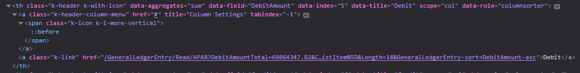 {"title":"Debit","headerAttributes":{"data-field":"DebitAmount","data-title":"Debit","data-aggregates":"sum"},"width":"300px","template":"#= kendo.toString(DebitAmount,\u0027c\u0027)#","footerTemplate":"#=kendo.toString(sum,\u0027c\u0027) #","field":"DebitAmount","encoded":true,"aggregates":["sum"]}